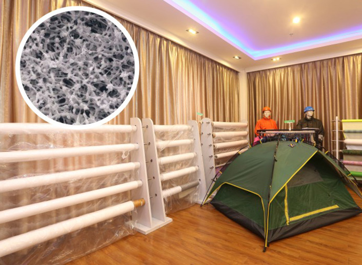 ePTFE防水透湿复合面料是将ePTFE薄膜通过PUR热溶胶复合方式将薄膜贴合到各种纺织面料上,称之为“可呼吸功能面料”。