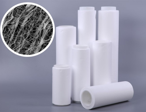 ePTFE防水透气膜以PTFE树脂为原料,经特殊工艺、双向拉伸、利用独特技术把ePTFE成型为直径100-500纳米之间的微孔薄膜,而且每平方厘米拥有10多亿个孔,微孔比水蒸气分子大700 倍,比水分子小10000倍,使该膜既允许空气及水蒸气自由透过薄膜,同时将水拒之膜外,有效保护电子元件使用寿命。